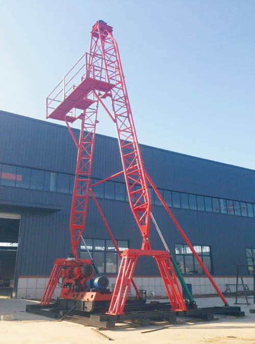 AY-13型鉆塔可配套各種水井鉆機和XY系列巖芯鉆機直、斜孔的施工。其特點為設計除具有承載能力較大、結(jié)構(gòu)合理、液壓起塔安全,拆裝、搬運成本低等特點外,顯著特點是一是塔腳跨度大(5米),操作鉆機空間大;二是塔身下塔腿鏈接鉸鏈高于底座底梁2.3米,從而在鉆機左右擺放時下塔腿不影響鉆機前后移車,鉆機動力部分可移至塔腿支撐內(nèi)檔中。也使得斜孔鉆進和提鉆過程中天車、回轉(zhuǎn)、井孔達到三點一線,大大提高了定向井孔施工的安全性。