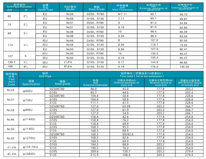 摩擦焊鉆桿及接頭執(zhí)行API / SPEC/5DP和 SY/T5561-2008標(biāo)準(zhǔn),鉆桿現(xiàn)有DZ50、R780、 G105、S135鋼級,均經(jīng)過局部或整體熱處理, 機(jī)械性能滿足標(biāo)準(zhǔn)要求;接頭采用優(yōu)良的合金鋼35CrM。、4137H等調(diào)質(zhì)處理,螺紋由數(shù)控車床、成型刀具加工,表面鍍銅或磷化處理,防粘扣性能良好。也可根據(jù)客戶要求定制生產(chǎn)。
